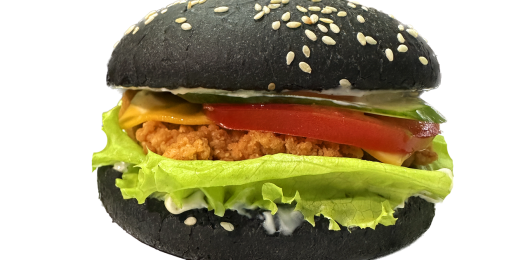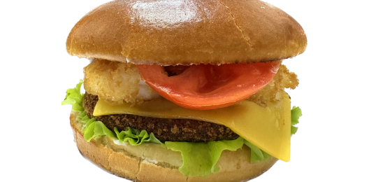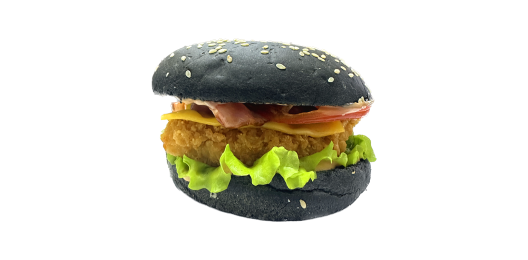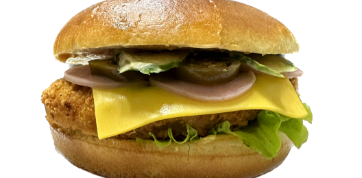 Котлета куриная, сыр чеддер, картофель фри, лук фри, маринованный огурчик, лист салата, соус фирменный, булочка на выбор