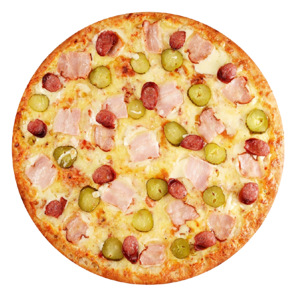 Охотничьи колбаски, бекон, маринованные огурчики, перчик халапеньо, моцарелла, соус белый острый